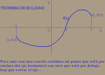 Sea pues f(x) una función continua en un intervalo cerrado [a,b] de la recta real, es decir, su gráfica no se corta. Supongamos que f(a) y f(b) sean valores de distinto signo (por ejemplo, f(a)>0 y f(b)<0), o lo que es lo mismo, que la gráfica de f(x) tenga un punto por encima del eje horizontal (el (a,f(a))) y otro por debajo (el (b,f(b))). Parece lógico pensar que la gráfica de f(x) corte al eje horizontal, o dicho de otra forma, que f(x) se anule en algún punto c del intervalo [a,b] y al no anularse en los extremos, debe hacerlo en el intervalo abierto (a,b).