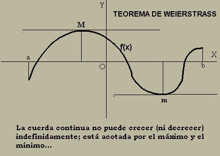 Hay otra propiedad que parece que debe cumplir una función continua f(x) en un intervalo cerrado [a,b] que es la siguiente: la función, al dibujarse con un solo trazo en el intervalo cerrado, no puede tomar valores que crezcan indefinidamente tanto por arriba como por abajo (como podría hacer en un intervalo abierto); más bien, parece que los valores que toma deben estar limitados, es decir, que la función debe tener un máximo y un mínimo absolutos. Esto es lo que asegura el teorema de Weierstrass que dice: